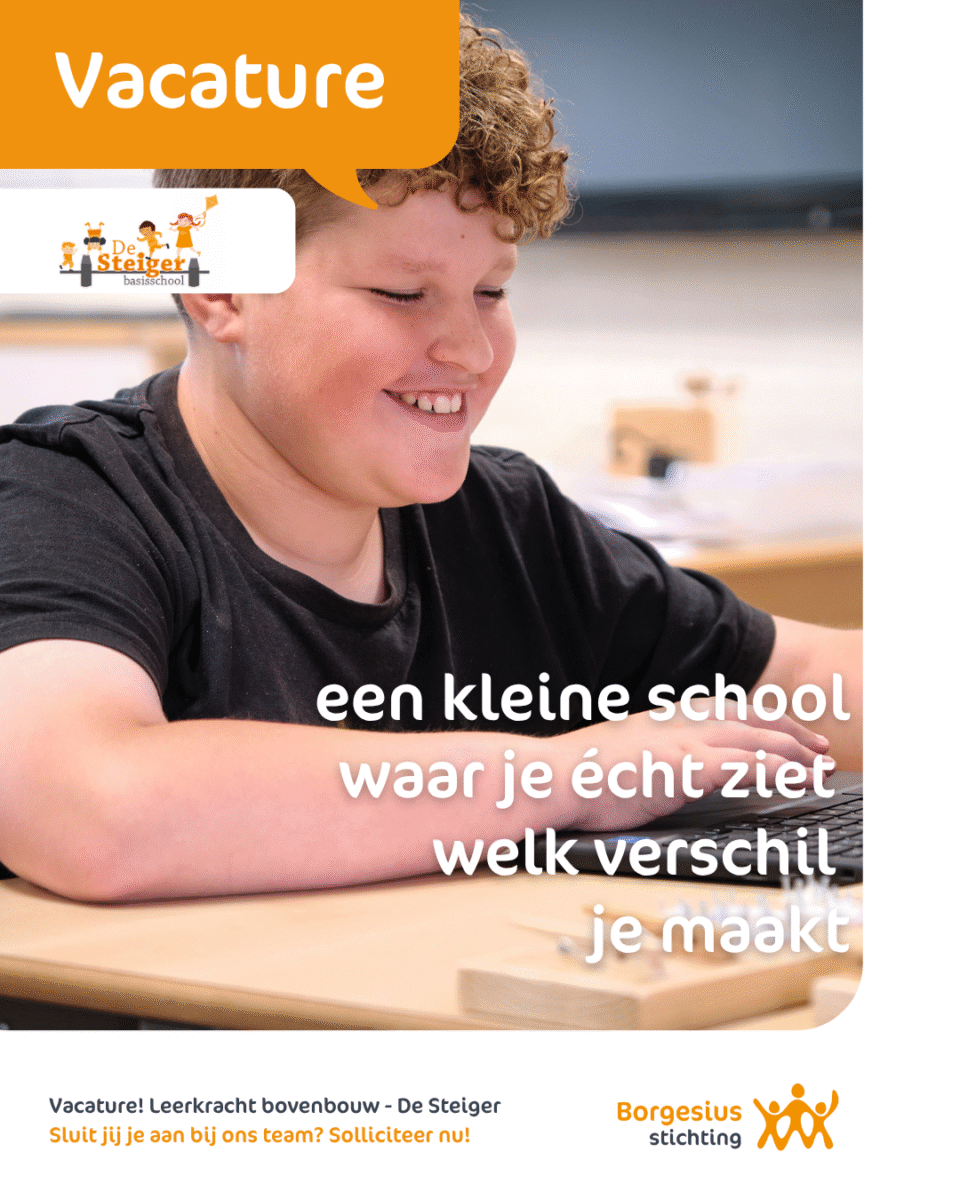 Dan is dit jouw kans! Basisschool De Steiger zoekt een betrokken en ervaren leerkracht voor groep 7/8. In ons kleinschalige kindcentrum in het hart van Stampersgat werk je in een hecht team aan betekenisvol onderwijs. Hier ken je je leerlingen bij naam, krijg je de ruimte om je talenten in te zetten én maak je elke dag echt het verschil. Nieuwsgierig? Lees snel verder!